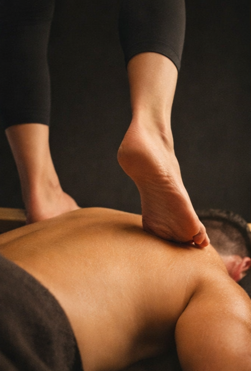 A deeply grounding barefoot massage that uses slow, sustained pressure from the soles of the feet to target chronic tension and restore structural balance.